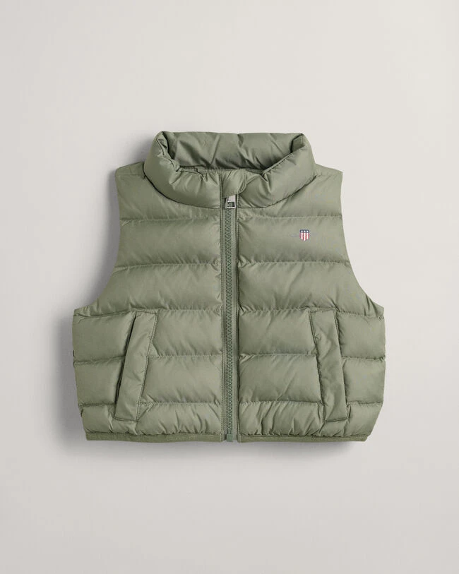 Designed in a regular fit and lightly padded for an extra layer of warmth, this Baby Puffer Vest is detailed with slanted front pockets and a GANT shield printed at the chest. Perfect for tiny outdoor adventures.