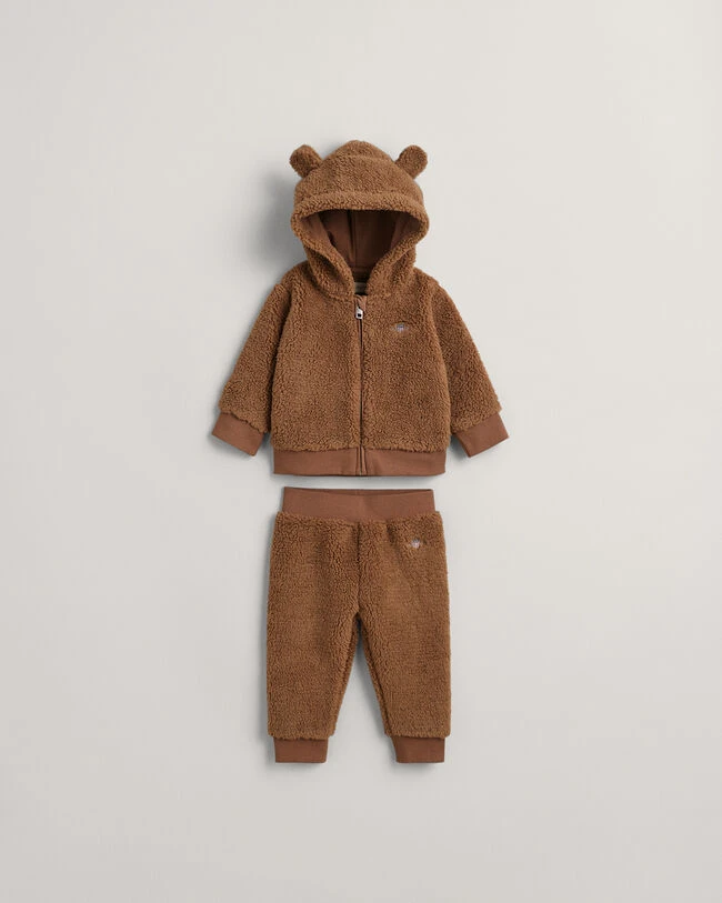 Crafted in pile fleece for a super soft feel, this fluffy unisex fit set features pants and a fully-lined zip hoodie. The pants are designed with a soft waistband to give better comfort for your little one, whilst the hoodie is adorned with small ears on the hood to make for an even cuter look. Both pieces are embroidered with a small-scale shield graphic.