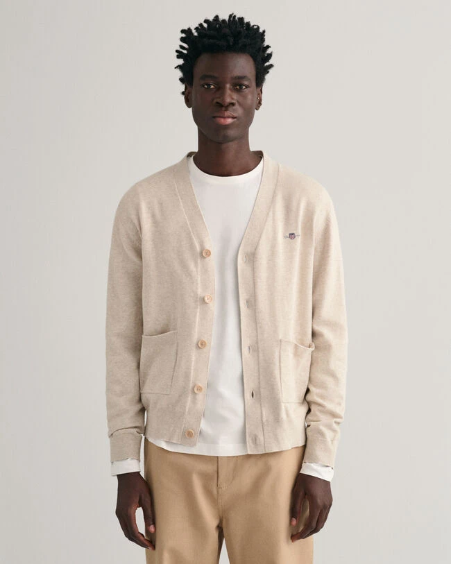 Crafted from cotton in a regular fit, this V-neck sweater is versatile, classic and elegant. It features details like ribbed endings at the hem and sleeve cuffs, branded corozo button closure and a GANT shield graphic embroidered at the chest. Wear it over a dress shirt with tailored pants and an elevated shoe for a truly timeless style.