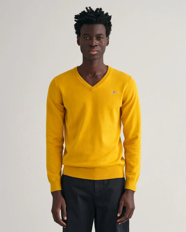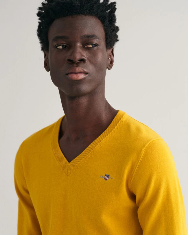Crafted in cotton and cut in a regular fit, this V-neck sweater features a GANT shield graphic embroidered at the chest. Perfect for layering, wear it over a dress shirt with tailored pants and an elevated boat shoe for a quintessential preppy look.