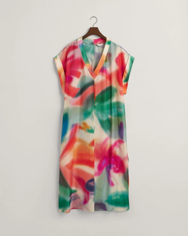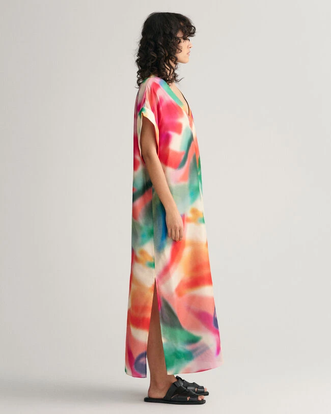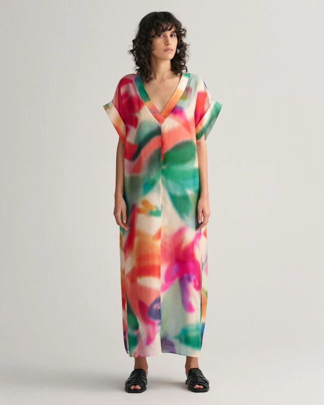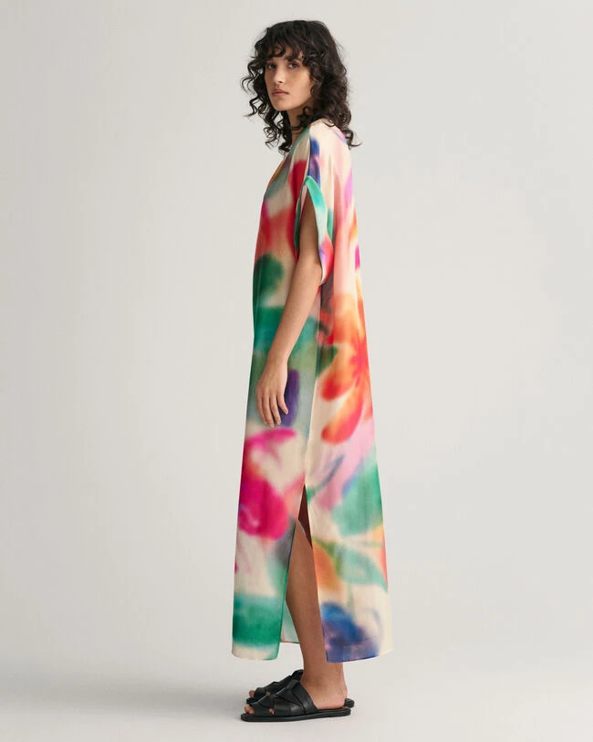 By the sea or in the city, this midi caftan is a summer staple. Cut for an oversized fit, it features a seasonal floral print that’s been hand-painted and developed by our in-house graphics studio. It has short sleeves, a V-neck with a wide placket, short folded sleeves and side hem slits. Style with simple flats and sunglasses. This garment is intended for an oversized fit. For a closer fit, we recommend sizing down.