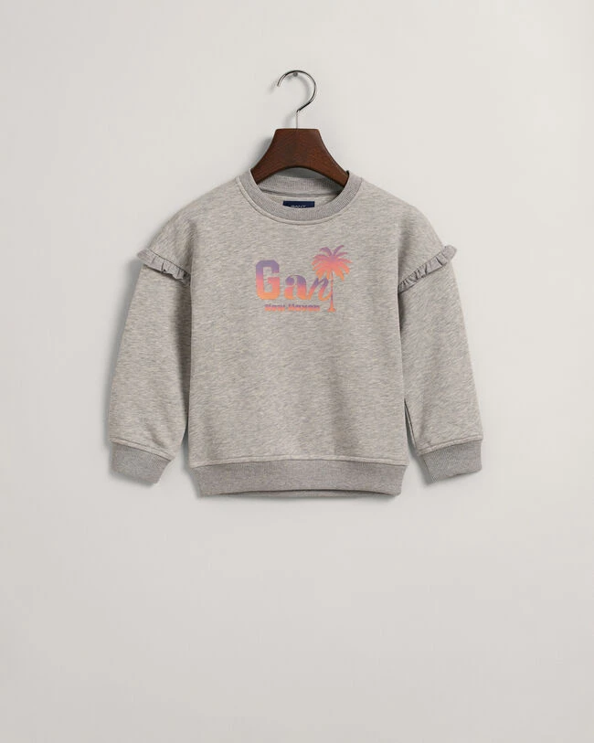 Perfect for weekends and school days, this crew neck sweater features a tropical GANT graphic printed at the chest. This piece is finished with frills at the shoulders and ribbed detailing at the collar, hem and cuffs.