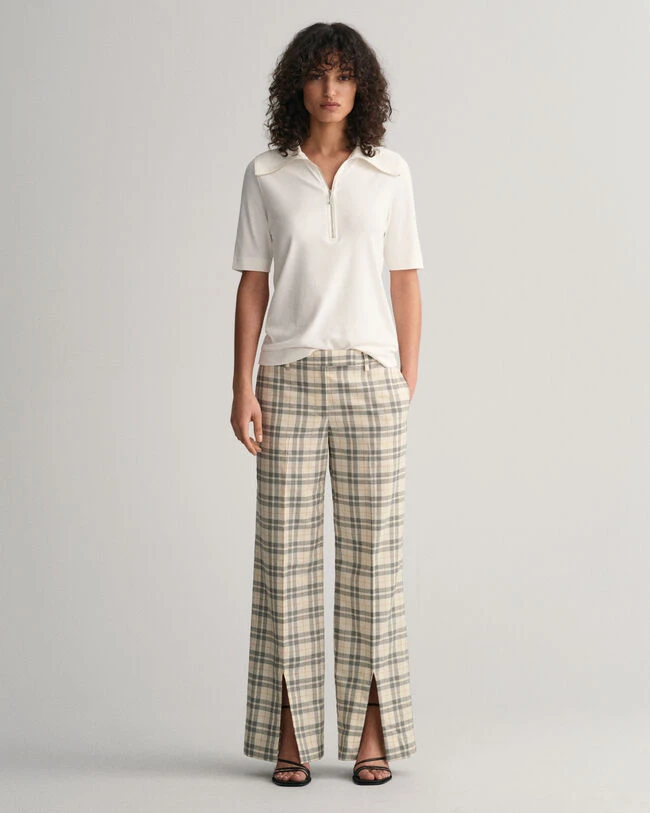 Made in a premium wool blend that’s perfect for the transeasonal months, these pants feature a yarn-dyed check that’s been developed by our in-house graphics studio. Designed to be worn low on the waist, they have a relaxed fit and straight leg. Design details include side seam pockets, creases at the front and back and slits at the front leg hem. Style with tank tops for an effortless look, or heeled boots for an elevated approach.