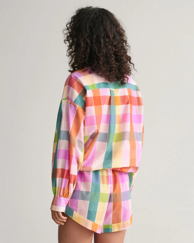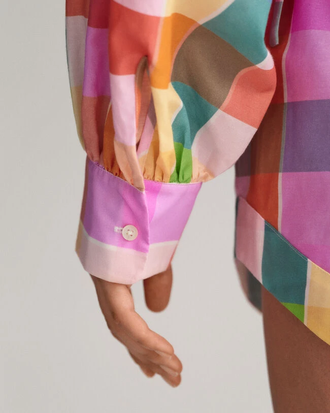 Crafted in a fine cotton-silk blend, this popover blouse is designed in a vibrant checked print for a dose of color. Cut for a relaxed fit, it has a stand collar, flap chest pockets, a drawstring hem and wrinkle detailing at the sleeves. Pair with flared jeans and wide leg trousers for an easy summer outfit. This garment is intended for a relaxed fit. For a closer fit, we recommend sizing down.