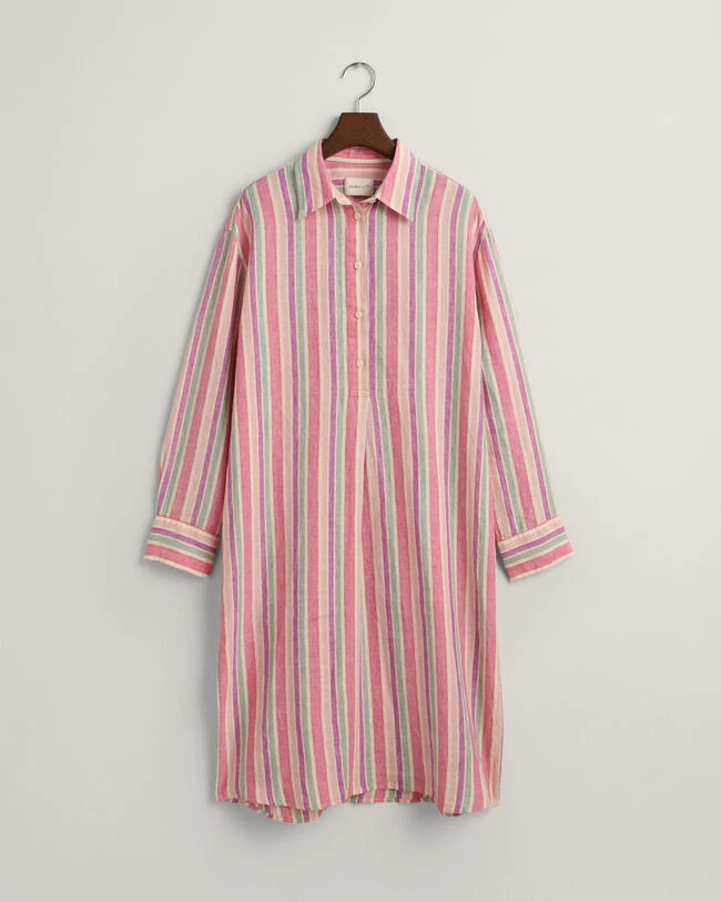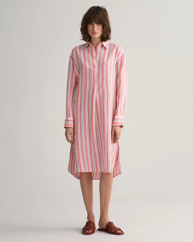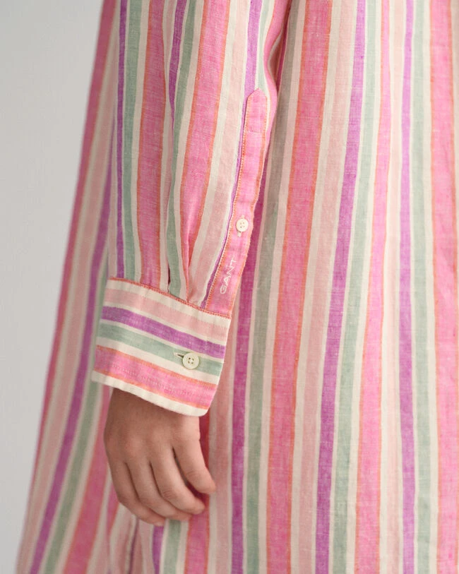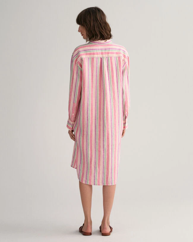Crafted in 100% washed linen for a soft and crisp feel, this dress is yarn-dyed with colorful multi stripes. Cut for a relaxed fit, it puts a twist on classic shirting details such as the wide point collar, side hem slits, a half placket with pleat detailing, our logo embroidered at the sleeve and a box pleat with our signature locker loop at the back. Style with white sneakers for an effortless summer look. This garment is intended for a relaxed fit. For a closer fit, we recommend sizing down.