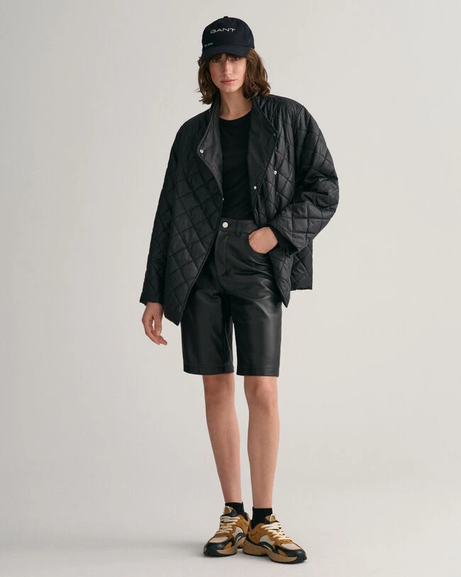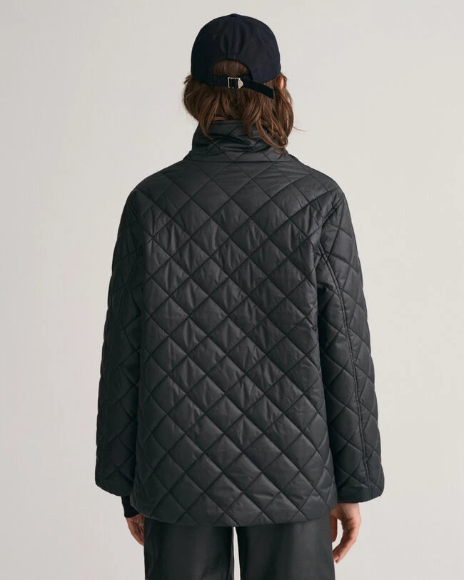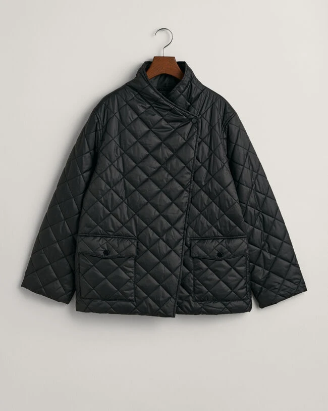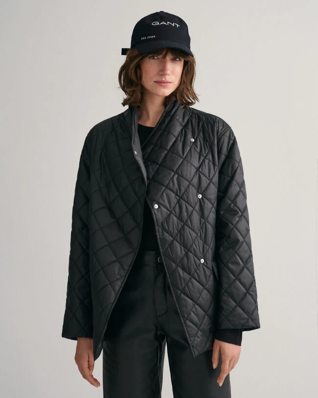 Constructed from lightweight certified recycled polyester throughout the entirety of its design, this quilted jacket is treated with a water-repellent finish. Fully lined and featuring diamond quilted padding, this jacket is cut for a regular fit that is straight through the body, relaxed at the sleeves and finishes at hip length. Further design details include an asymmetrical front closure, a stand-shaped collar, patch pockets and snap buttons. Designed to be layered, style over pants, tees, knits and more.