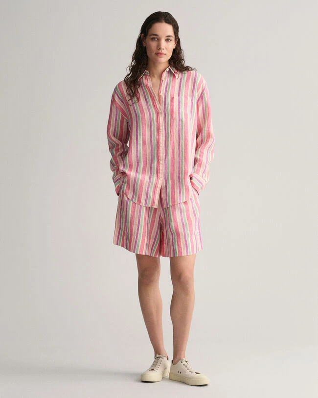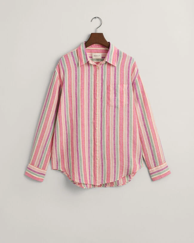 Crafted in 100% washed linen for a soft and crisp feel, this shirt is yarn-dyed with colorful multi stripes. Cut for a relaxed fit, it features a point collar, chest pocket, adjustable cuffs, a curved hem and a box pleat with our signature locker loop at the back. Style yours with tailoring and denim alike or throw over swimwear for an easy beach look. This garment is intended for a relaxed fit. For a closer fit, we recommend sizing down.