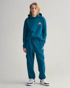 Inspired by functional cargo pants, these sweatpants are cut in a comfortable, relaxed fit. They feature two slanted side pockets and two cargo-style patch pockets at the mid-thigh.