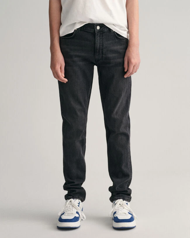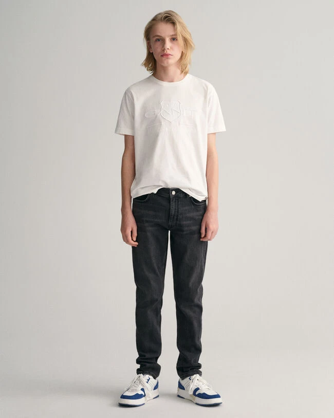 Crafted in comfort stretch cotton, these jeans for teen boys are cut in a slim fit. A wardrobe essentia, they pair perfectly with knitwear and dress shirts alike.