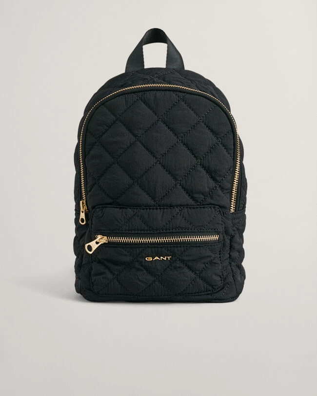 This quilted mini backpack is styled with gold metal trims for a sleek, sophisticated feel.