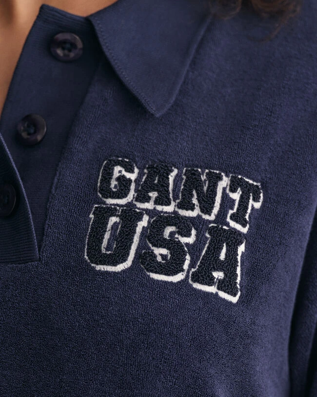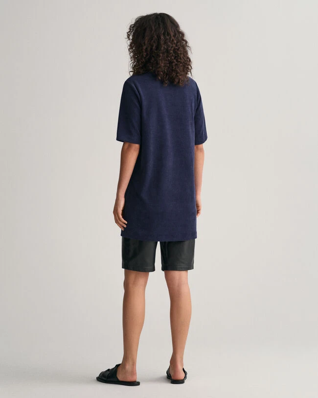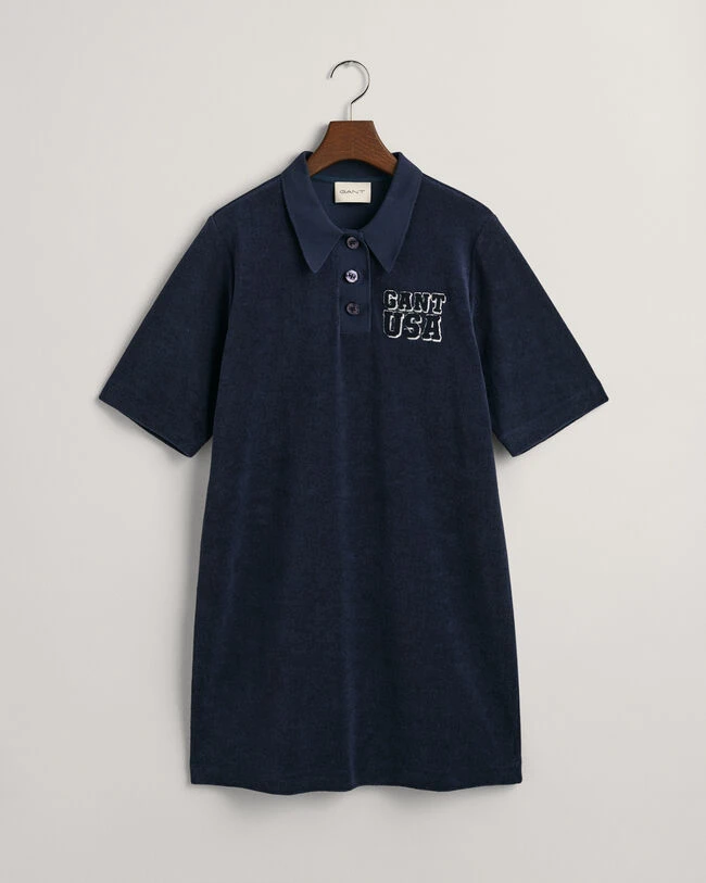 Equal parts style and comfort, this polo dress is crafted from a soft and fuzzy terry cloth. Designed with wide and dropped shoulders to enhance the relaxed fit, it features a polo collar, side hem slits and a GANT USA graphic patch at the chest. Pair with sneakers for an easy collegiate-inspired look. This garment is intended for a relaxed fit. For a closer fit, we recommend sizing down.