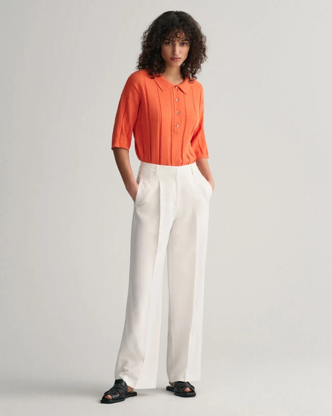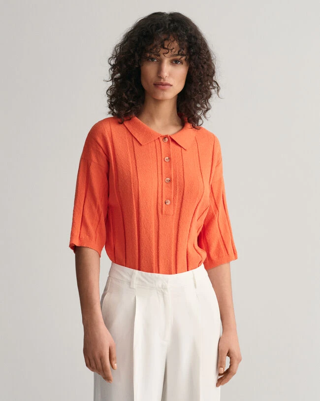 A timeless basic reinvented, this polo sweater is updated in a cotton-terry cloth and patterned with stripes. Designed in a wide rib structure, it features short sleeves and a polo collar for an extra sporty touch. This garment is intended for a relaxed fit. For a closer fit, we recommend sizing down.