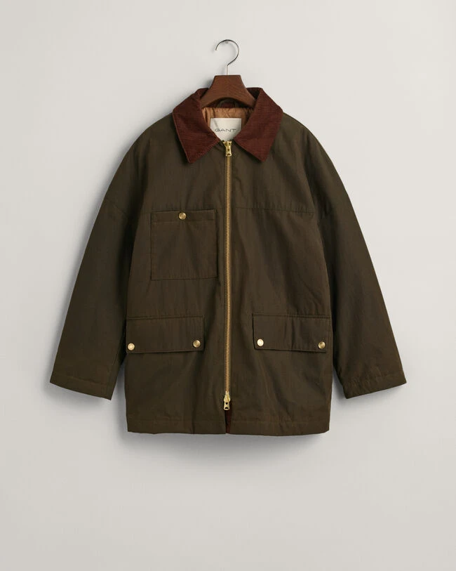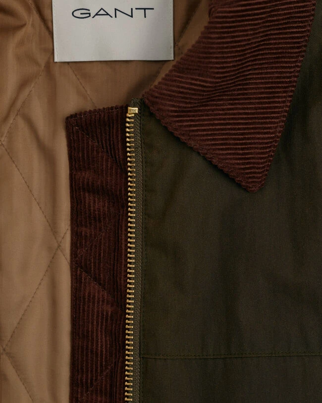 Designed to keep you warm and dry, this jacket features a dry waxed coating with a padded diamond quilted interior. Featuring a contrasting corduroy shirt collar for added texture, it is complete with wide dropped sleeves, patch and flap pockets and a metal zip front. Versatile enough for the outdoors and indoors, style over jeans and sneakers or boots and athletic wear for active days out. This garment is intended for a relaxed fit. For a closer fit, we recommend sizing down.